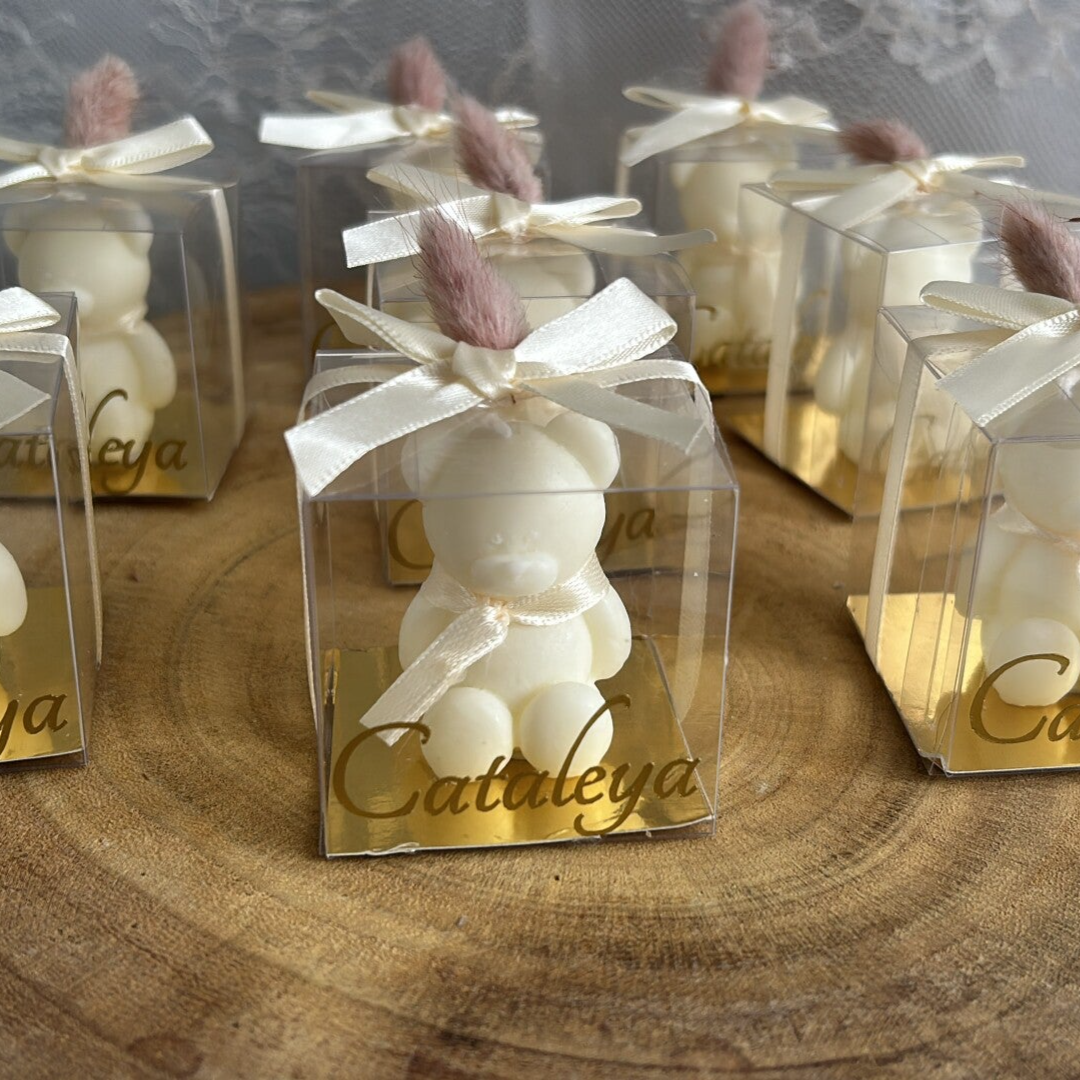 Kaarsje in een vorm van een beer, wprdt verpakt in doosje Inclusief Strik,Naamlabel en Droogbloemen .