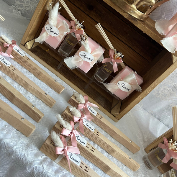 Mogelijke in verschillende kleuren. Versierd met lint en droogbloemen.
