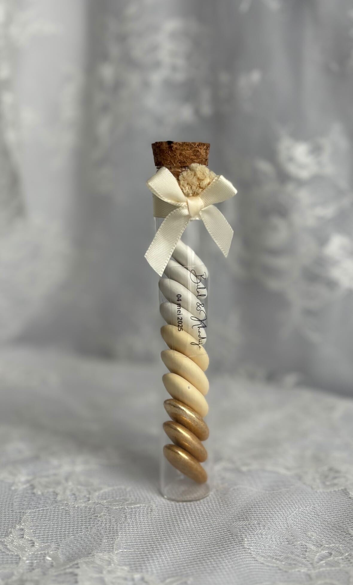 Glazen buis met kurk gevuld met dragees. Kleuren kunnen geheel naar wens worden aangepast.
