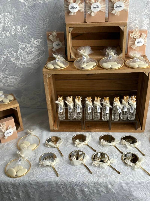 Variatie 1 :luxe doosje ,lint, droogbloemen naamlabel of naamsticker.