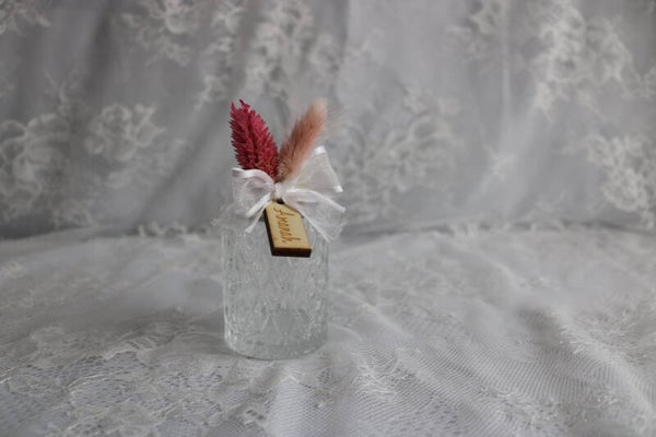 Deze wordt geleverd met strikje, droogbloemen en papieren naamlabel.