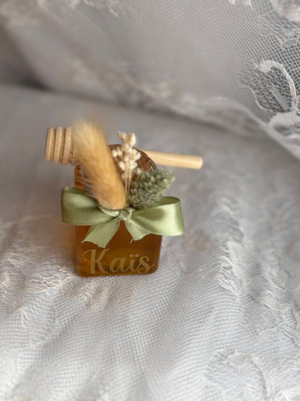 gevuld met honing of zonder. Versierd met naamsticker, strikje en droogbloemen